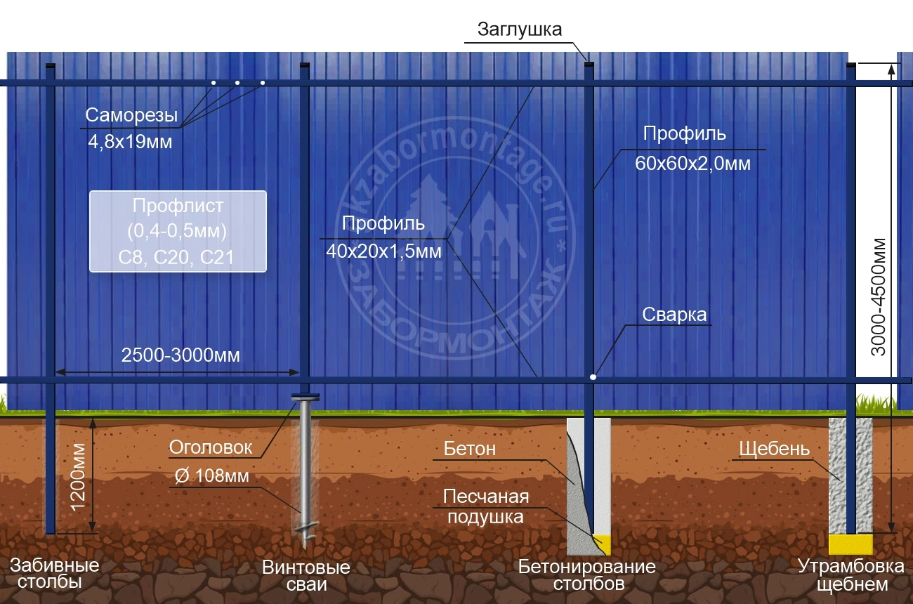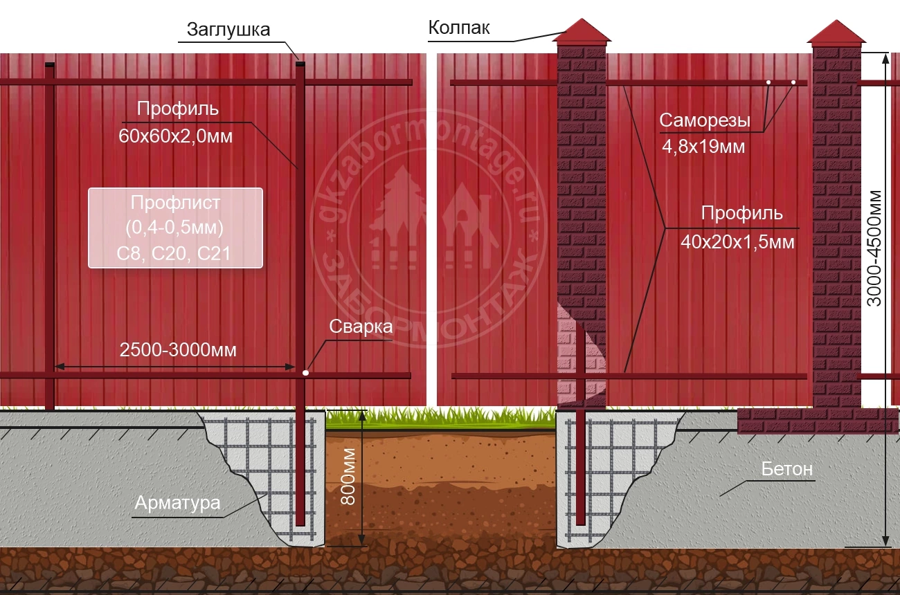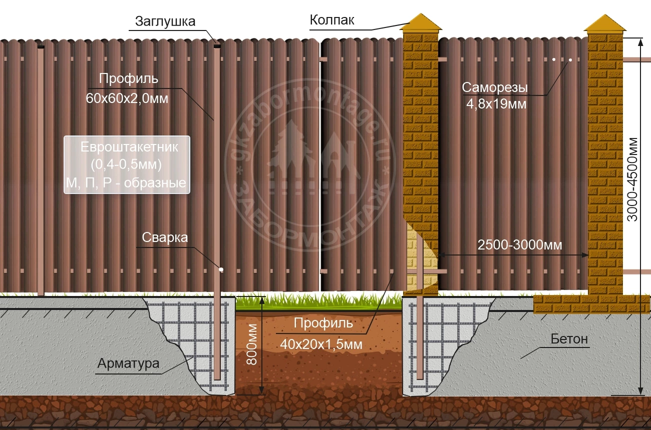 Конструкция забора из евроштакетника на ленточном фундаменте